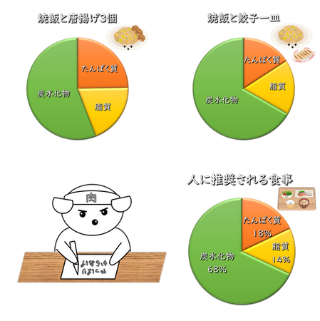今回は、焼飯の三大栄養素の割合です。これまでのピラフと同じような割合だと思ってた。この商品はたんぱく質が多い。ホントに?って疑わないで!私!きっと具がいっぱい♪卵がいっぱい♪わくわく♪おかずに餃子を追加するか、唐揚げを追加するか…たんぱく質を増やすためには唐揚げだね!